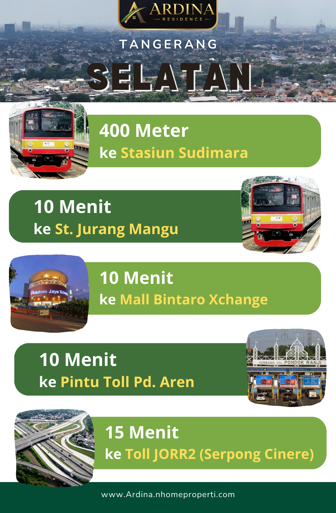 Lokasinya sangat strategis, penghuni dapat menjangkau Stasiun Sudimara, Stasiun Pondok Ranji, maupun Pintu Tol Pondok Aren dalam waktu singkat. Setiap unit mengusung desain minimalis kontemporer yang memberikan kesan modern, rapi, dan fungsional.